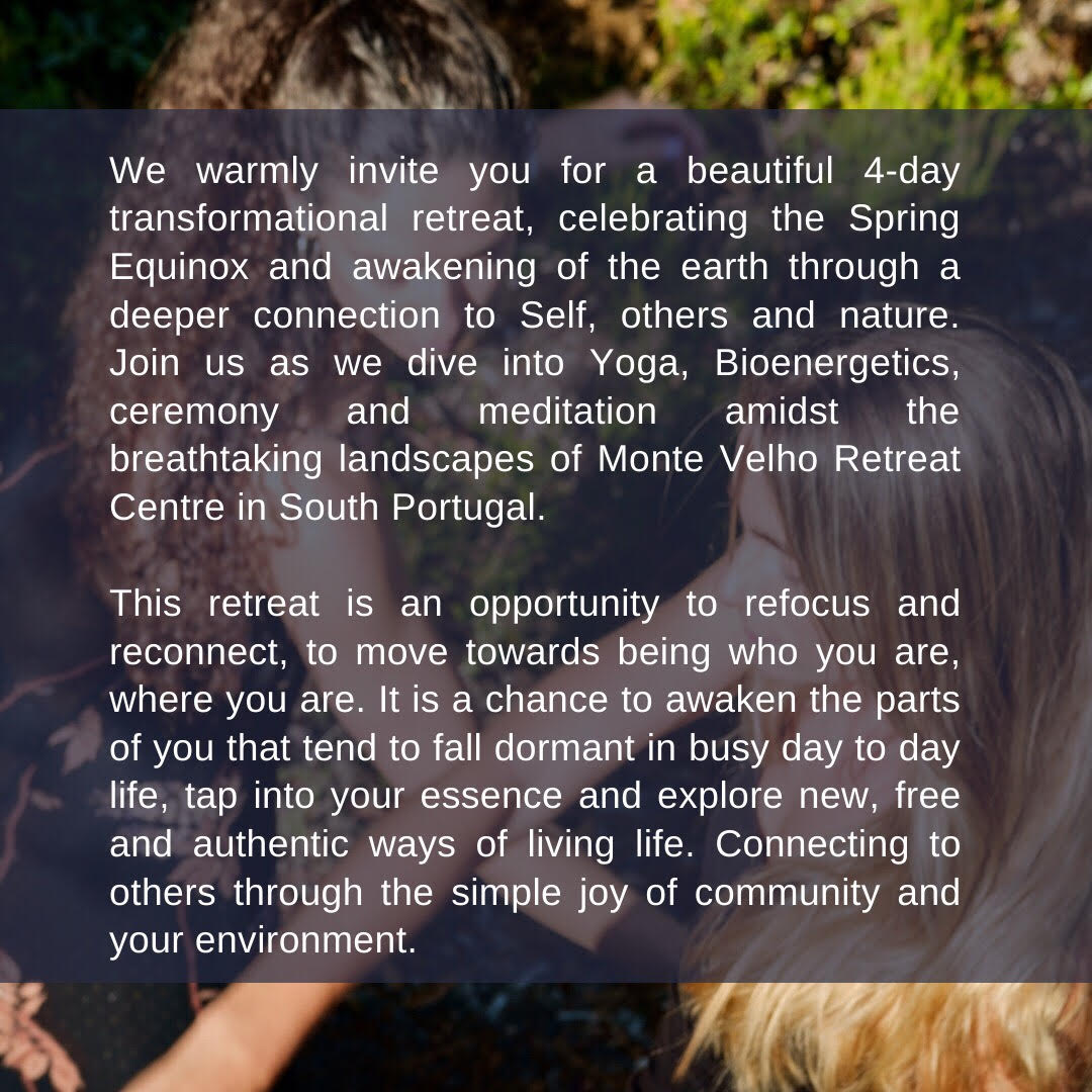 Neste encontro de mulheres, vamos dar espaço e abertura, para um despertar de um novo auto-conhecimento. Vamos olhar de forma diferente e acolhedora para quem nós somos na nossa essência. Sem julgamentos e críticas, vamos desenvolver a autoestima para que aconteça uma profunda e consciente transformação, física, mental e físico-espíritual, com ajuda da meditação, vivências e partilhas.